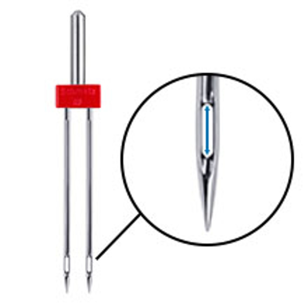 L’aiguille métallique jumelle peut être utilisée sur les machines à coudre domestiques courantes qui ont une fonction en zigzag. Comme les autres aiguilles ménagères, elle s’insère dans la tige de l’aiguille : le côté plat du piston pointe vers l’arrière.