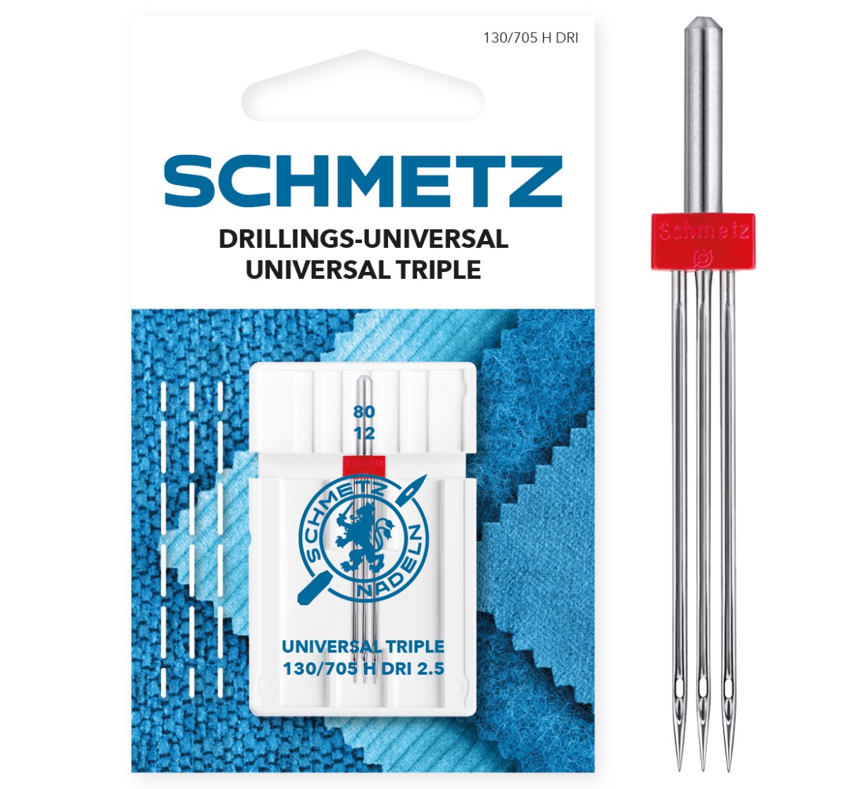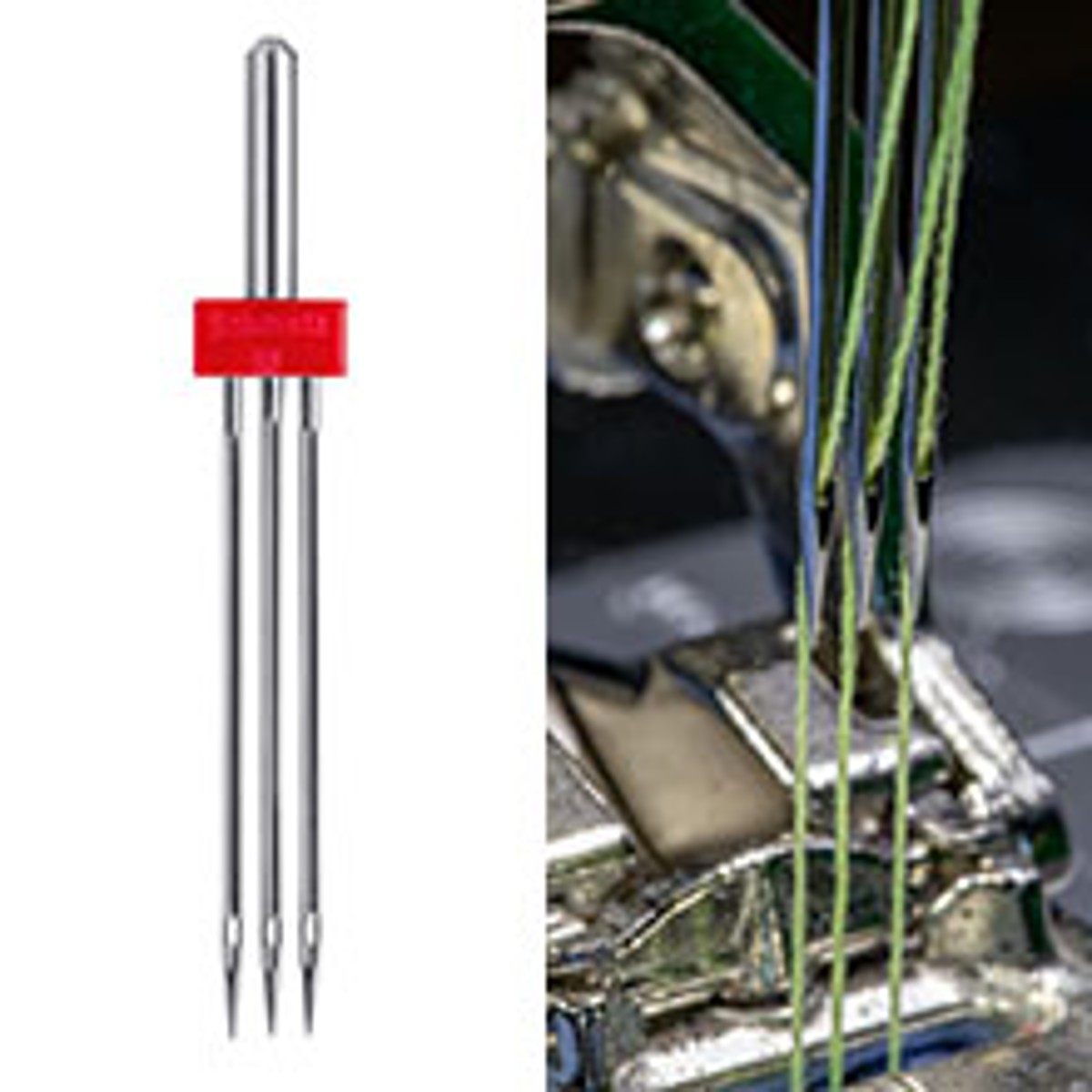 L’aiguille universelle triple peut être utilisée sur les machines à coudre domestiques courantes qui ont une fonction en zigzag. Comme les autres aiguilles ménagères, elle s’insère dans la tige de l’aiguille : le côté plat du piston pointe vers l’arrière.