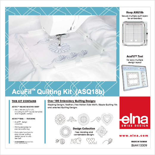 Ce kit contient le cerceau carré pour Quilting de 184 sur 184 mm, une grille de repères, des clips magnétiques, une série de motifs de broderie pour le Quilting, des chablons et un calculateur (compatible windows) pour vous aider à positionner vos motifs sur un quilt de n’importe quelle taille.