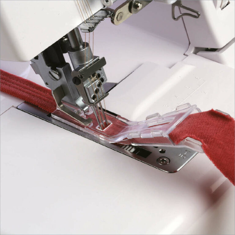 Avec l’aide de ce pied, vous pouvez créer des passants de ceinture de type confection en utilisant un ourlet large ou triple. En effet, la spirale placée en amont du pied replie automatiquement les bords de biais, de brides ou de bretelles.