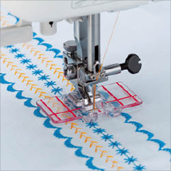 Le pied pour point satin avec guides vous permet de coudre à intervalle régulier des points satin ou des points décoratifs! Utiliser les lignes de repère rouges pour guider votre couture ou pour centrer vos points décoratifs. Plus besoin de tirer des fils ou de marquer des lignes au feutre!
