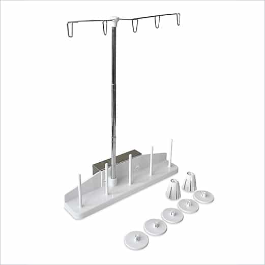 Le porte bobines vous donne la possibilité de préparer plusieurs bobines de fils lorsque vous brodez. Très pratique pour les cônes industriels. Le fil se déroule régulièrement et sans à coup. Se fixe facilement à la machine.