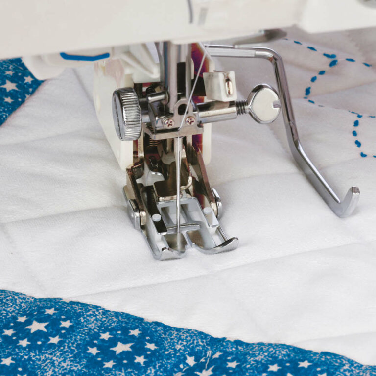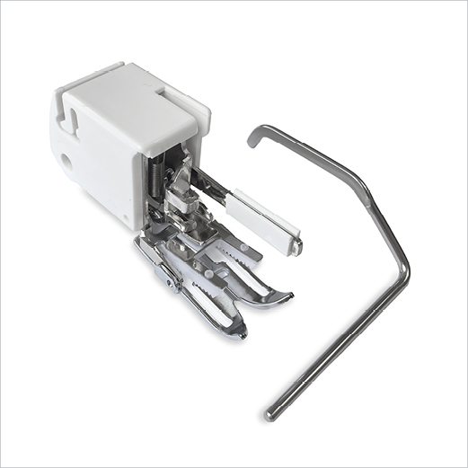 Ce pied est indispensable pour empêcher les différentes couches de rembourrage de glisser et pour aligner les rayures ou carrés. Grâce à ce pied les tissus sont maintenus entre les griffes inférieures et supérieures pour une couture simultanée des épaisseurs sans déplacements de ces dernières.
